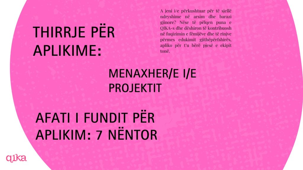 QIKA është hapësirë për të reja e të rinj për të krijuar, punuar, lexuar, festuar e ëndërruar për një botë më të mirë e të barabartë për të gjithë. Ndërhyrja në diskursin publik përmes hulumtimeve, raportimeve, aksioneve dhe diskutimeve është motivi dhe metoda e qendrës sonë.