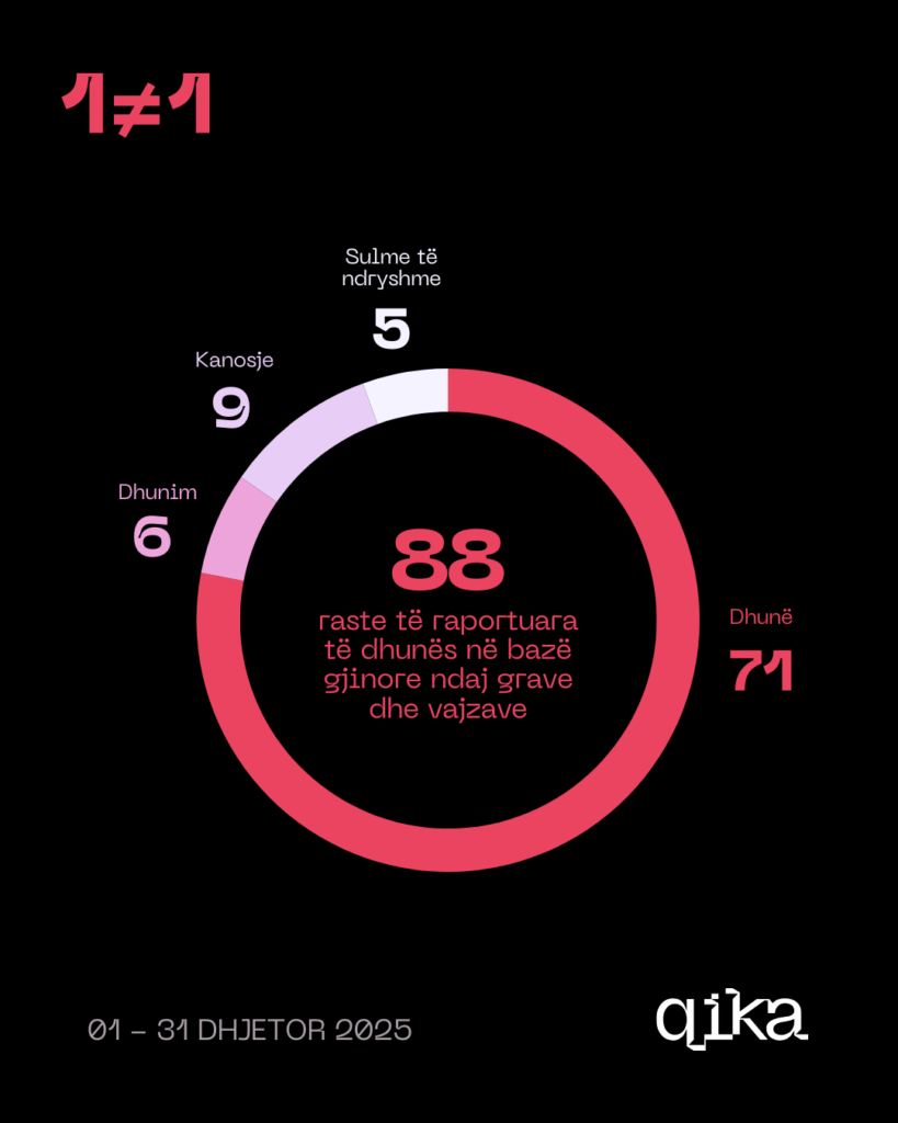 Sipas raporteve të Policisë së Kosovës nga data 1 – 31 dhjetor 2025, janë raportuar 88 raste të dhunës në bazë gjinore ndaj grave dhe vajzave në të cilat janë 106 viktima.