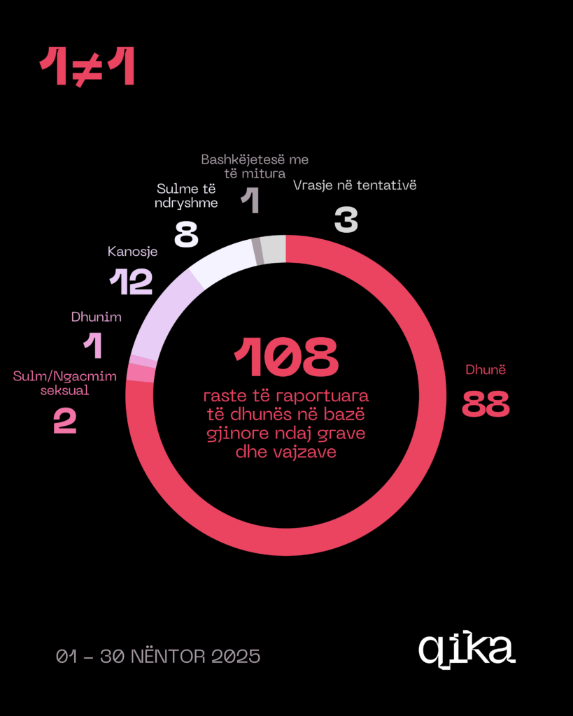 Sipas raporteve të Policisë së Kosovës nga data 1 – 30 nëntor 2025, janë raportuar 108 raste të dhunës në bazë gjinore ndaj grave dhe vajzave në të cilat janë 115 viktima.