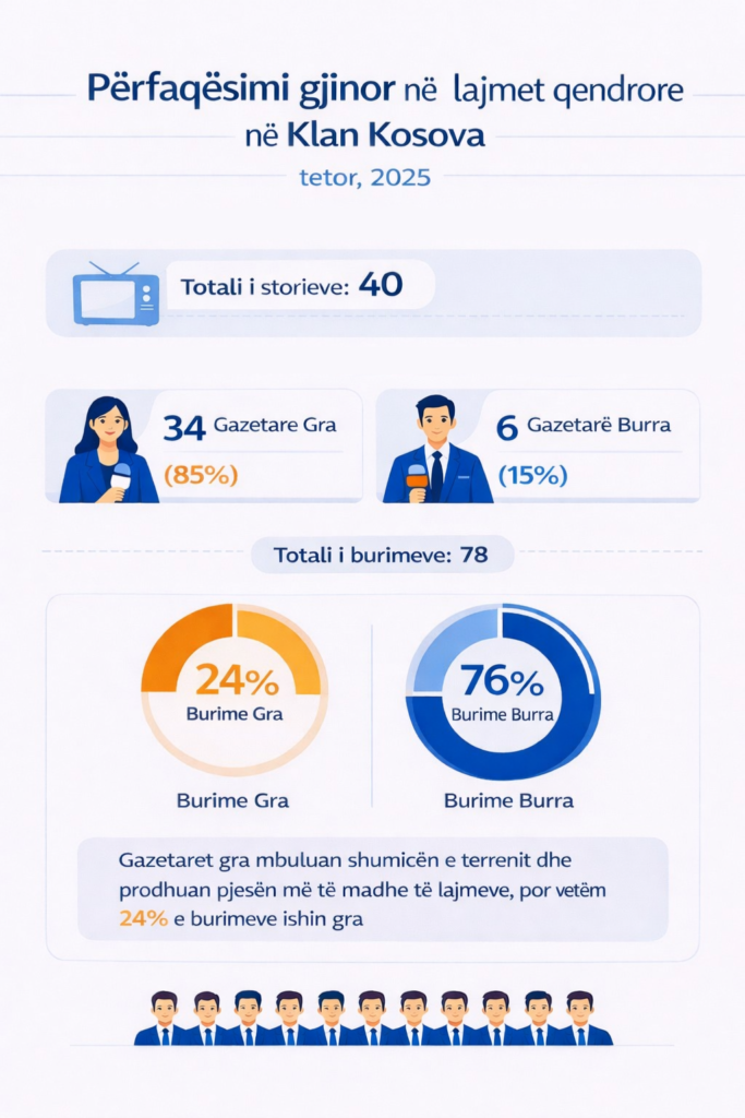 Në katër edicionet e lajmeve qendrore të Klan Kosovës u analizuan 40 storie, ku 34 prej tyre (85%) u realizuan nga gazetare gra. Megjithatë, nga 78 burime të përdorura, vetëm 24% ishin gra, ndërsa 76% burra. Pra, edhe pse gratë dominojnë në terren dhe në prodhimin e lajmit, zërat që dëgjohen mbeten kryesisht te burrave.