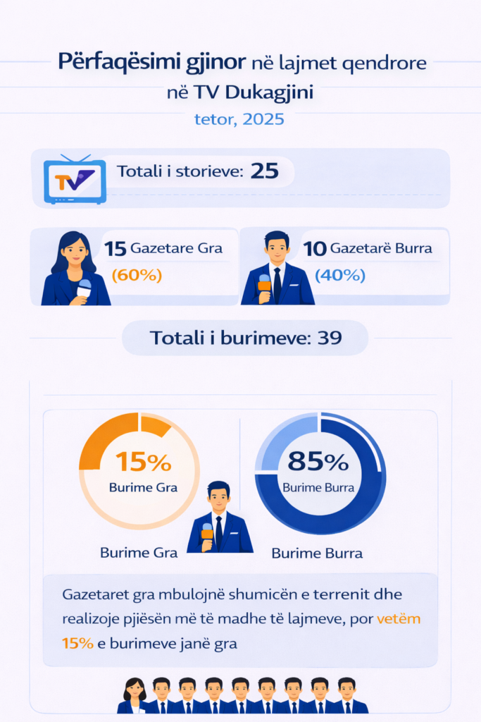 Në katër edicionet e lajmeve qendrore të TV Dukagjinit u analizuan 25 storie: 60% u realizuan nga gazetare gra dhe 40% nga gazetarë burra. Megjithatë, nga 39 burime të përdorura, vetëm 15% ishin gra, ndërsa 85% burra. Edhe në storiet e realizuara nga gazetare gra, burimet burra mbizotëronin.