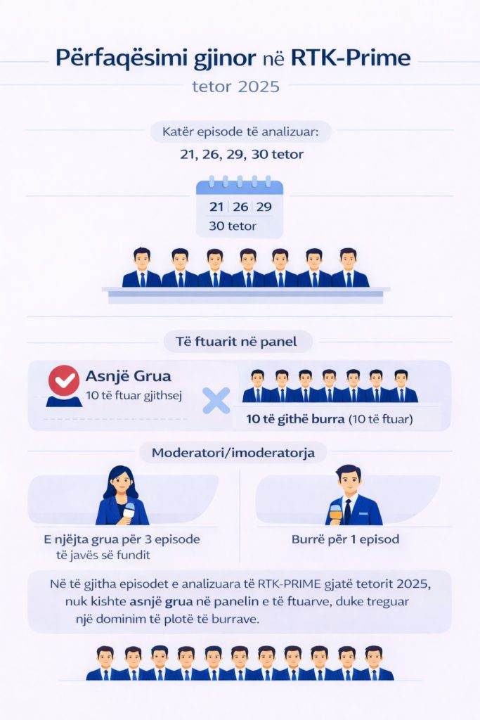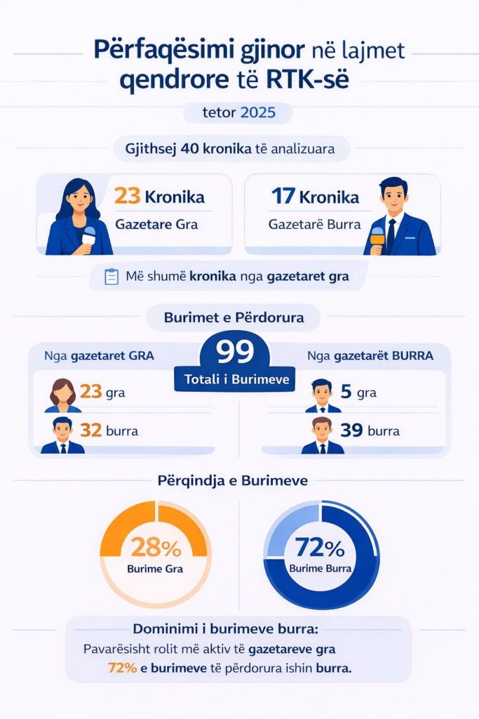 Gjatë katër edicioneve të lajmeve qendrore të RTK-së në tetor 2025 u analizuan 40 kronika. Prej tyre, 23 u realizuan nga gazetare gra dhe 17 nga gazetarë burra. Nga 99 burime të përdorura në total, vetëm 28% ishin gra. Edhe pse gazetaret gra përdorën më shumë burime gra sesa kolegët e tyre burra, burimet burra dominuan në të gjitha rastet, duke reflektuar një pabarazi të qëndrueshme në përfaqësimin e zërave në lajme.